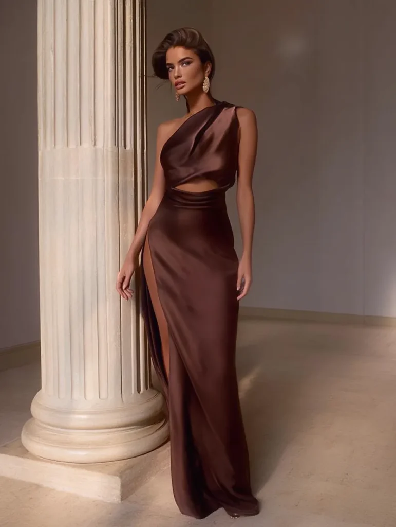 Elegant One-Shoulder Chocolate Gown A Perfect Wedding Guest Dress for Fall